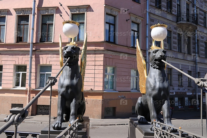 Россия, Петербург, 29 июня 2019 г. Крылатые львы на Банковском мосту. Грифоны на Банковском мосту на Фонтанке, по преданию, охраняют золотые сокровища, и тот, кто к ним прикоснется, станет богатым