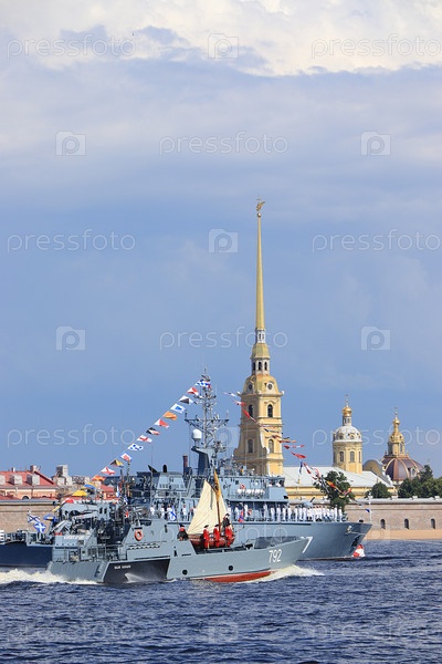Россия, Санкт-Петербург, 19 июля 2020 года. Ботик Петра Великого на фоне военного корабля «Серпухов» в акватории Невы во время парада ко Дню Военно-морского флота