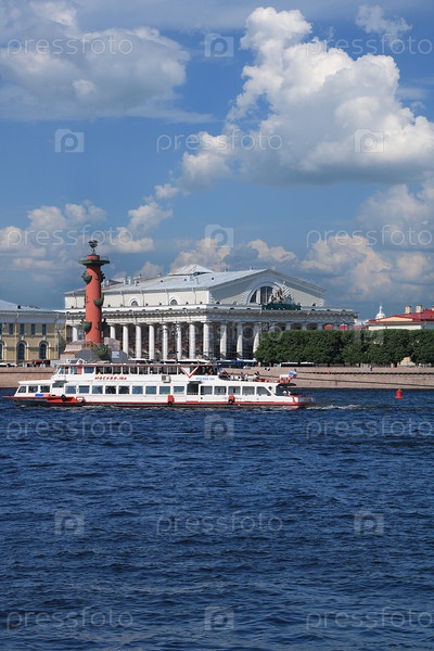 Россия, Петербург, 8 июня 2019 г. Стрелка Васильевского острова. На снимке — Ростральная колонна и здание Биржи на берегу Невы на фоне неба и прогулочный катер с туристами, любующимися видом на город