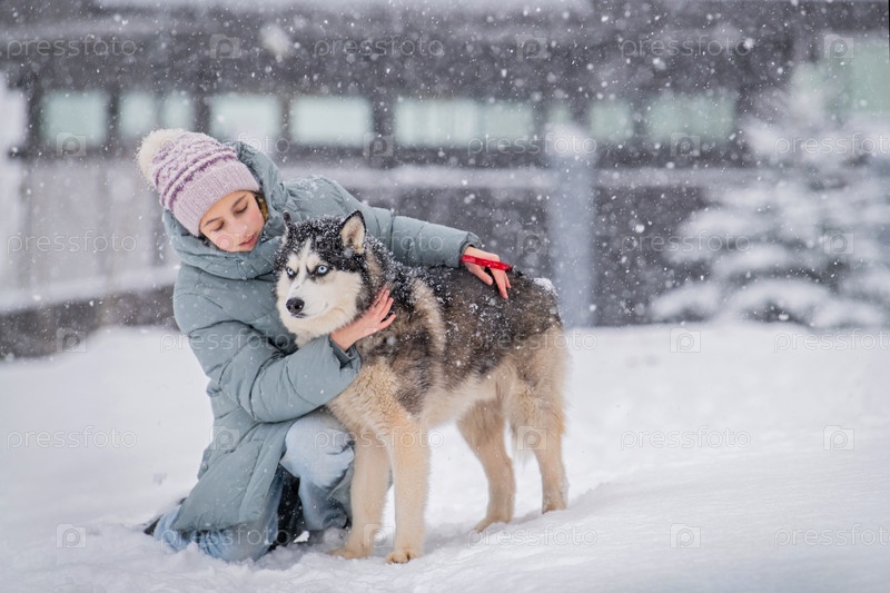 Молодая женщина в теплом пальто и шапочке обнимает свою собаку породы хаски в снежный зимний день на улице. Собака на прогулке со своим хозяином