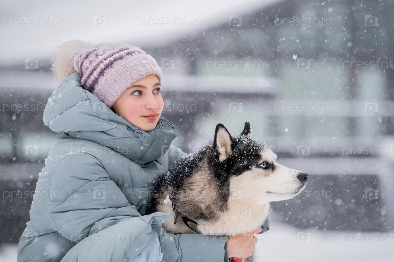 Молодая женщина гуляет со своей собакой породы сибирский хаски по снегу в зимний день, тренирует и гуляет со своей собакой. Дружба, собака на прогулке со своим хозяином