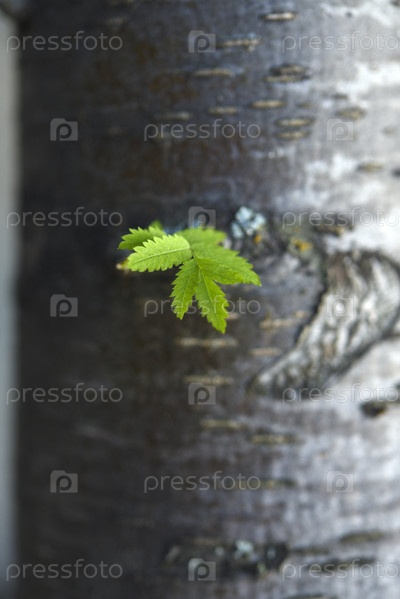 Зеленые листья на стволе дерева. Ствол и листья рябины