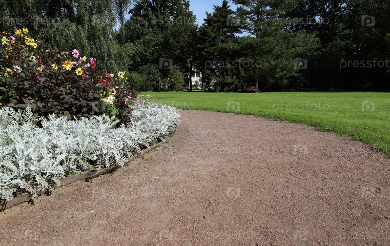 Дорожка в парке вымощена красной щебенкой и проходит между зеленым газоном и цветочной клумбой