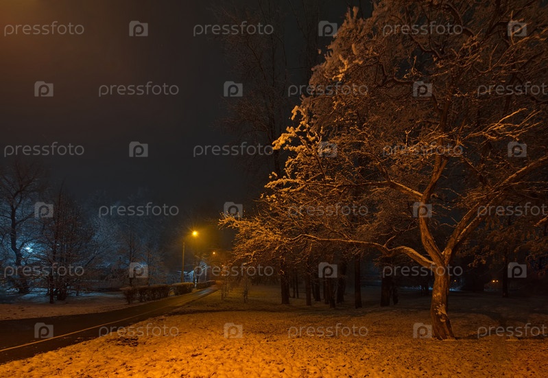 Новокузнецк, Россия. 01 ноября 2024 года. Живописный вечерний вид городского парка имени Юрия Гагарина, покрытые первым осенним снегом и подсвеченные фонарями холодного и теплого света