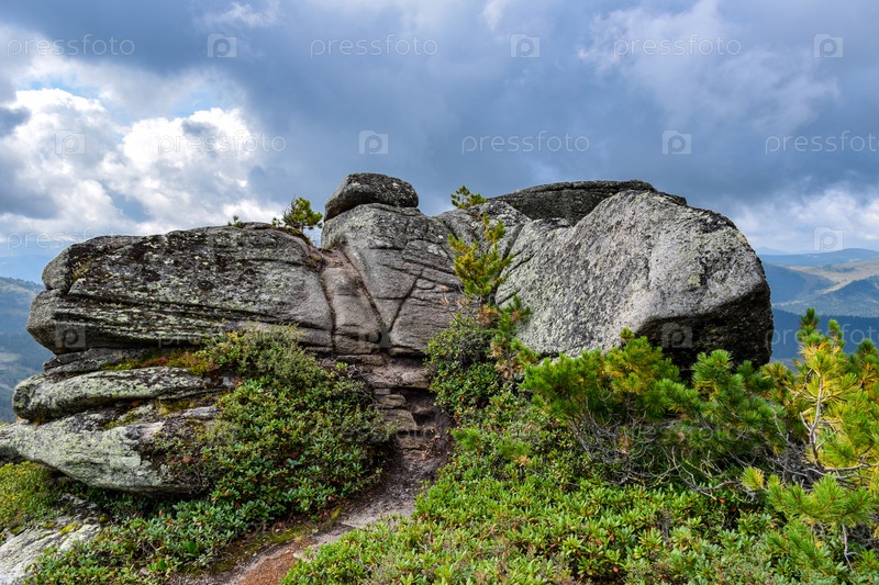 Горы, туман, горный пейзаж, Ергаки, лето, мегалиты, горная тайга