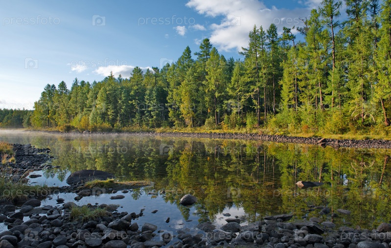 Россия, Западная Бурятия. Раннее утро на скрытом от посторонних глаз пустынном таежном озере Гузен-Нур на левом берегу реки Тиса