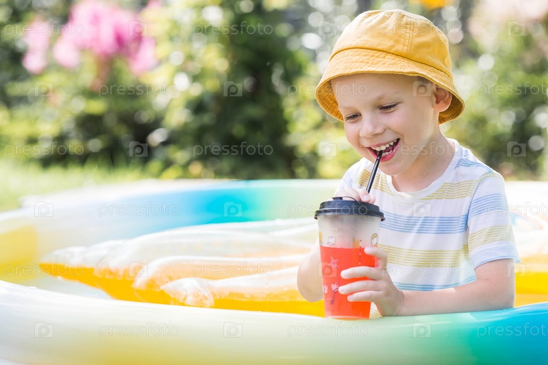 Жаркий летний день. Милый мальчик плавает в бассейне. Ребенок пьет освежающий лимонад. Концепция летних каникул с детьми и освежающими напитками