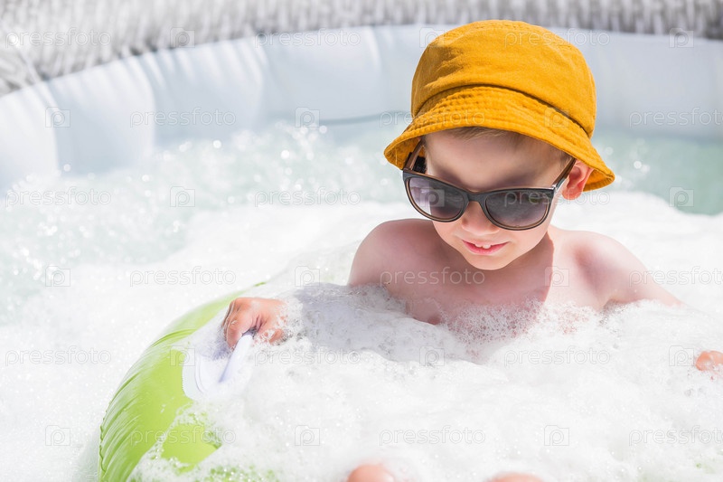 Жаркий день. Милый мальчик в солнечных очках и панаме плавает по кругу в пенном бассейне. Концепция летних каникул с детьми