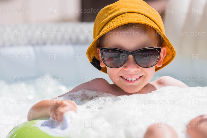Жаркий день. Милый мальчик в солнечных очках и панаме плавает по кругу в пенном бассейне. Концепция летних каникул с детьми