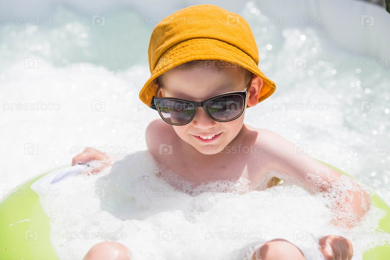 Жаркий день. Милый мальчик в солнечных очках и панаме плавает по кругу в пенном бассейне. Концепция летних каникул с детьми