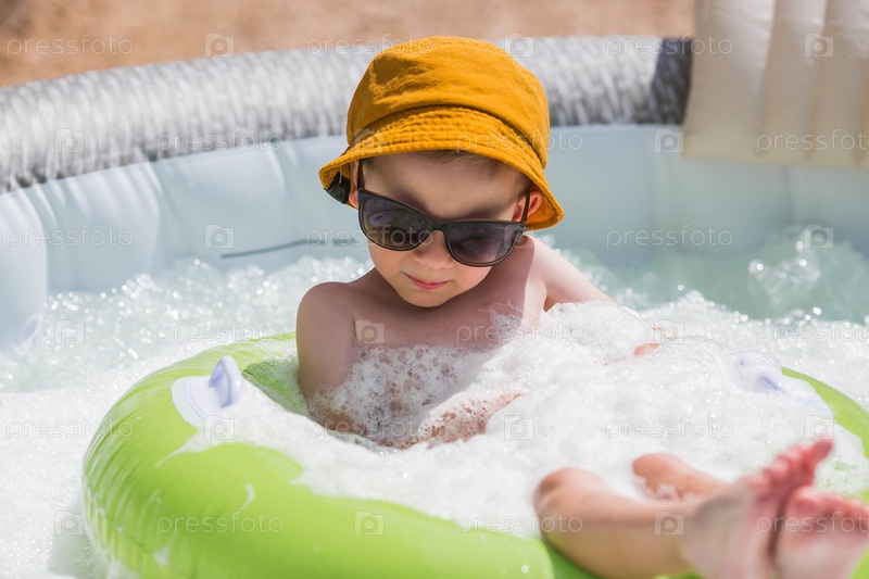 Жаркий день. Милый мальчик в солнечных очках и панаме плавает по кругу в пенном бассейне. Концепция летних каникул с детьми