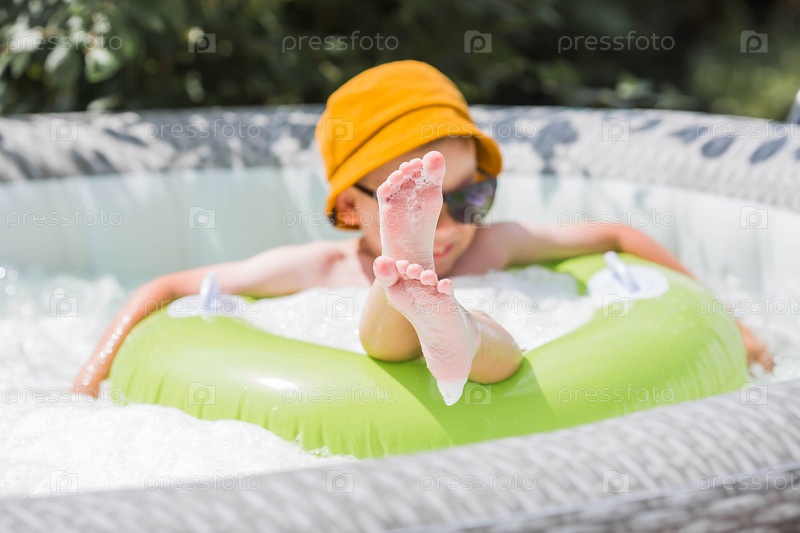 Жаркий день. Милый мальчик в солнечных очках и панаме плавает по кругу в пенном бассейне. Концепция летних каникул с детьми