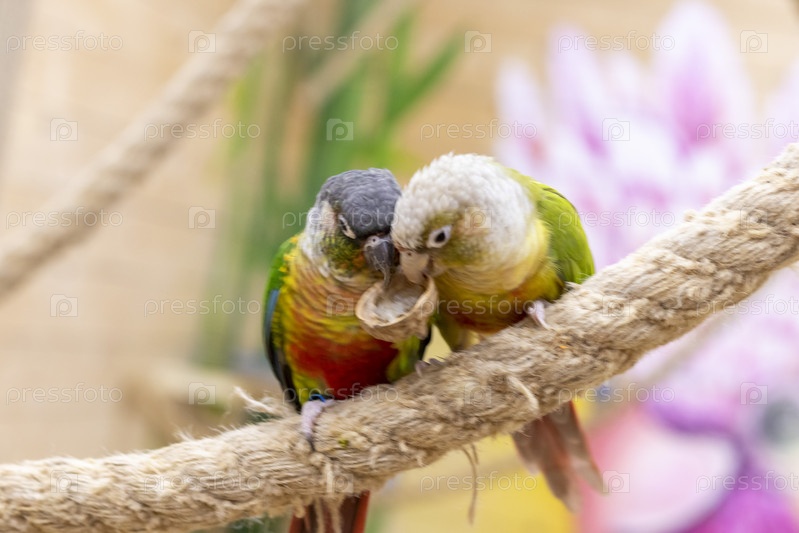 Крупным планом зеленощекие попугаи. Птицы