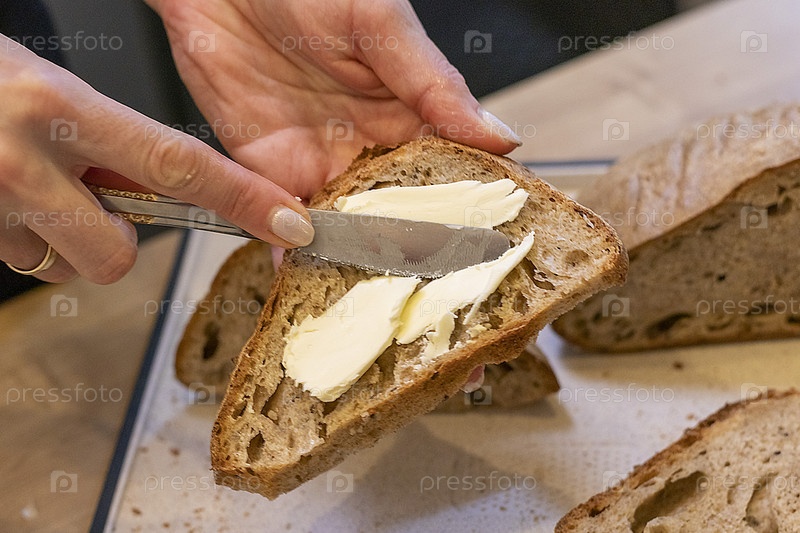 Женщина намазывает домашнее масло на ломтики свежеиспеченного домашнего ржаного хлеба. Еда