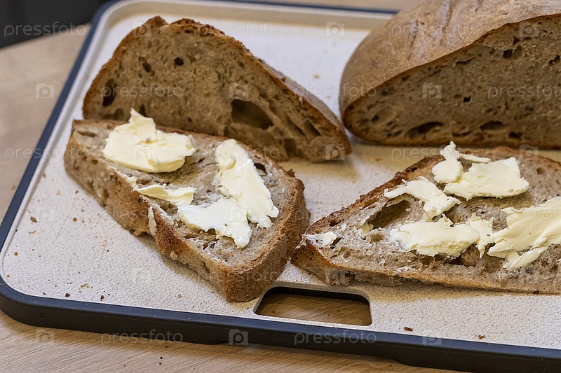 Кусочки свежеиспеченного домашнего ржаного хлеба с намазанным на них домашним маслом. Еда
