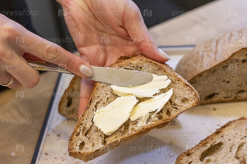 Женщина намазывает домашнее масло на ломтики свежеиспеченного домашнего ржаного хлеба. Еда