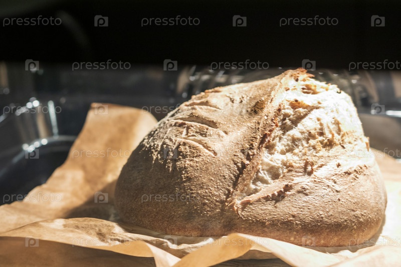 Снимок свежеиспеченной буханки домашнего ржаного хлеба в духовке. Еда