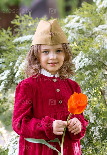 Концепция праздника 9 мая. Портрет красивой девушки в военной фуражке с цветком тюльпана. Празднование Дня Победы 1941-1945 гг