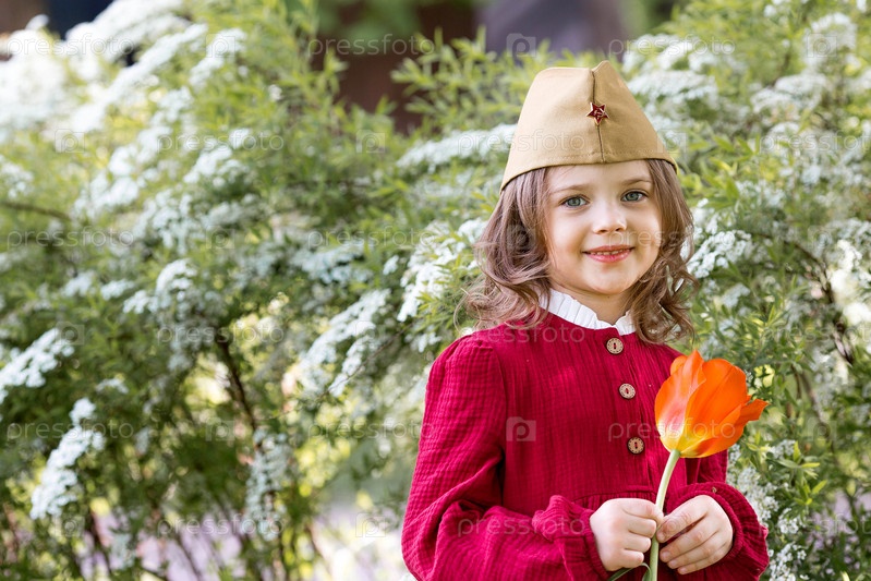 Концепция праздника 9 мая. Портрет красивой девушки в военной фуражке с цветком тюльпана. Празднование Дня Победы 1941-1945 гг