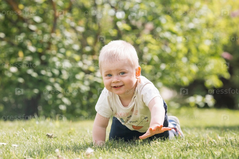 Портрет годовалого мальчика на улице. Счастливый ребенок гуляет в весеннем парке. Счастливое детство и отцовство