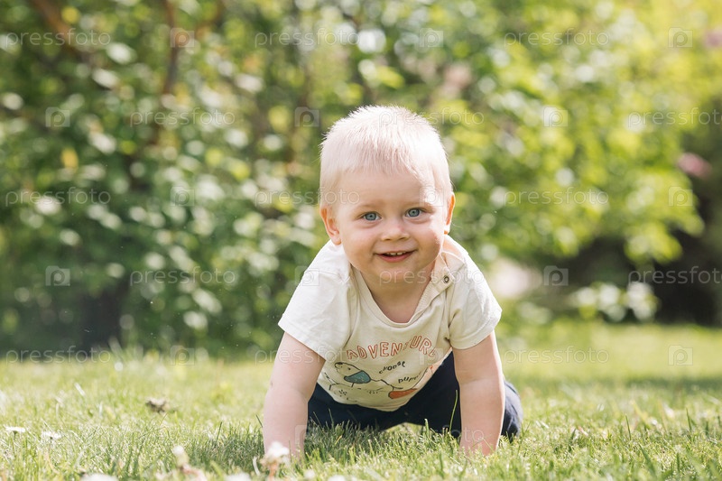 Портрет годовалого мальчика на улице. Счастливый ребенок гуляет в весеннем парке. Счастливое детство и отцовство