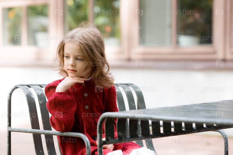 Портрет красивой 5-летней девочки в красном платье в парке. Детство