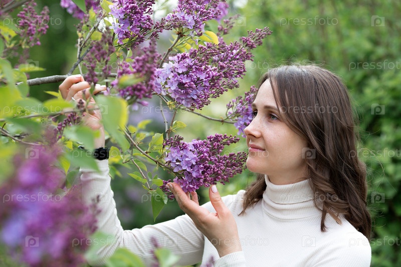 Весеннее цветение. Портрет красивой 30-летней молодой женщины в цветущем сиреневом саду на природе