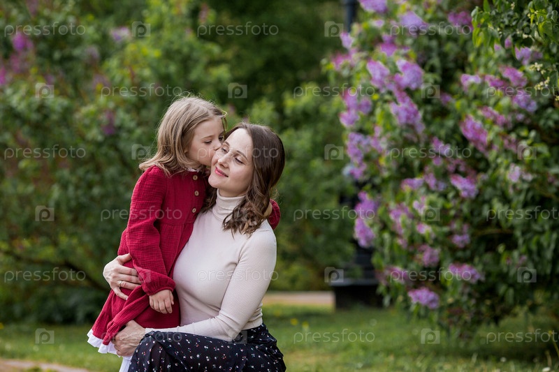 Семья и материнство. Весеннее цветение. Портрет красивой 30-летней матери и ее дочери в цветущем сиреневом саду на природе