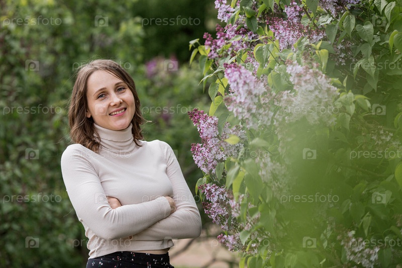 Весеннее цветение. Портрет красивой 30-летней молодой женщины в цветущем сиреневом саду на природе