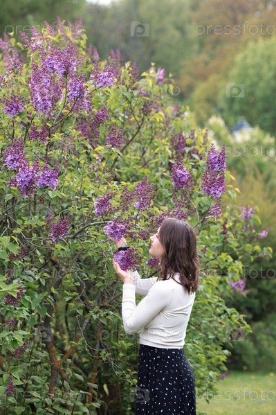Весеннее цветение. Портрет красивой 30-летней молодой женщины в цветущем сиреневом саду на природе