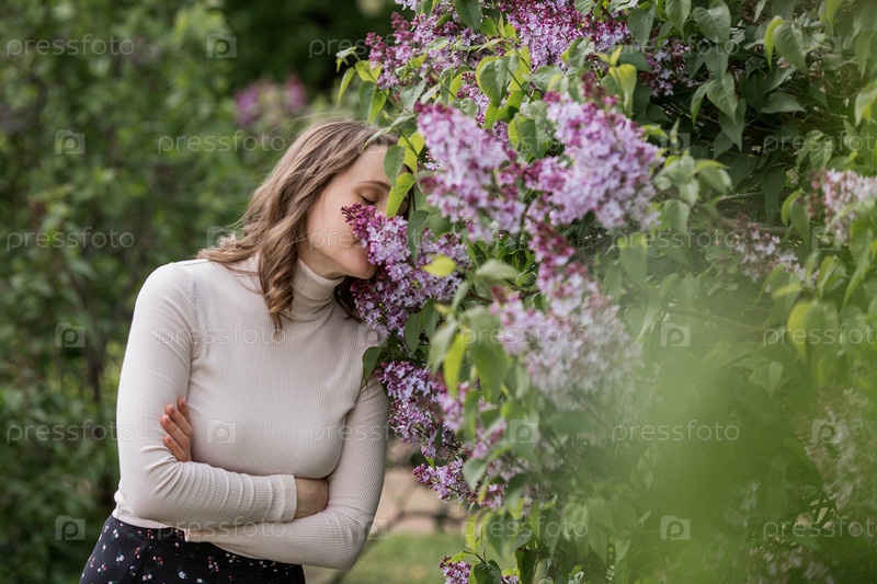 Весеннее цветение. Портрет красивой 30-летней молодой женщины в цветущем сиреневом саду на природе