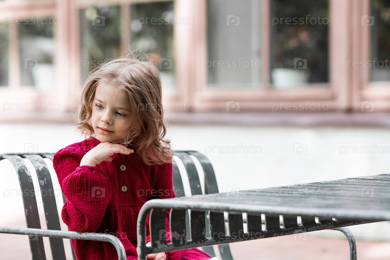 Портрет красивой 5-летней девочки в красном платье в парке. Детство