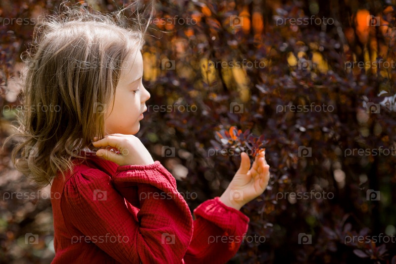 Весеннее цветение. Портрет красивой 5-летней девочки в красном платье в цветущем саду на природе. Детство