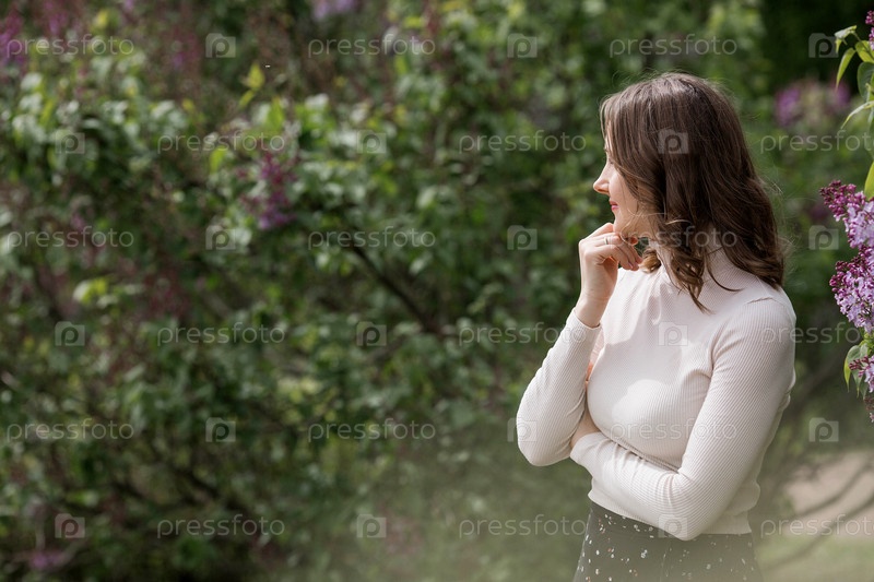 Весеннее цветение. Портрет красивой 30-летней молодой женщины в цветущем сиреневом саду на природе