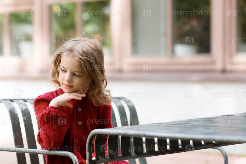 Портрет красивой 5-летней девочки в красном платье в парке. Детство