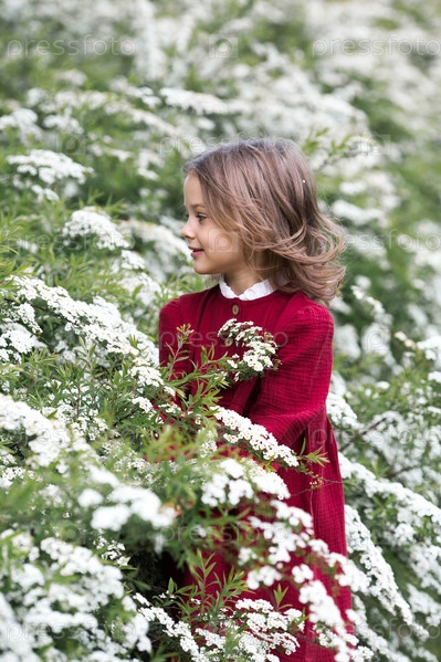 Весеннее цветение. Портрет красивой 5-летней девочки в красном платье в цветущем саду на природе. Детство