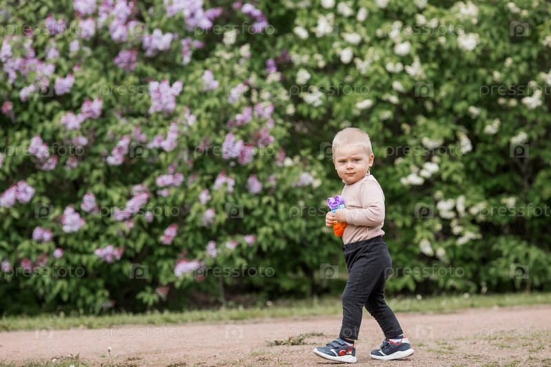 Красивый пушистый двухлетний ребенок в парке с красочной игрой Pop-it. Средство от стресса. Игрушка Pop It в детских руках