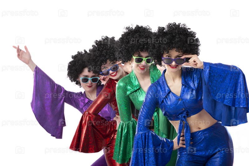 Группа девушек в ярких расклешенных костюмах и афро-париках позируют на белом фоне. Стиль диско восьмидесятых или семидесятых