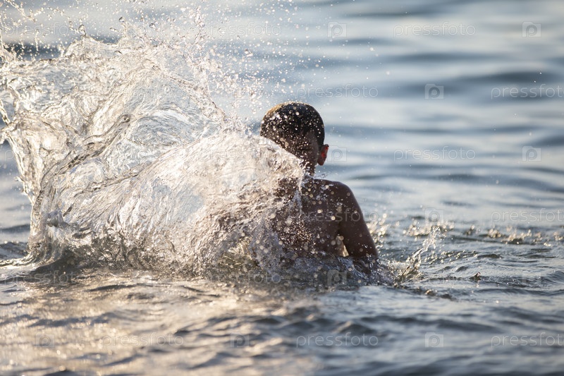 Счастливый подросток играет с морскими волнами. Мальчик плавает в море