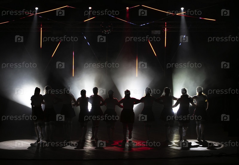 Темные силуэты танцующих девушек на фоне белого света прожекторов сцены