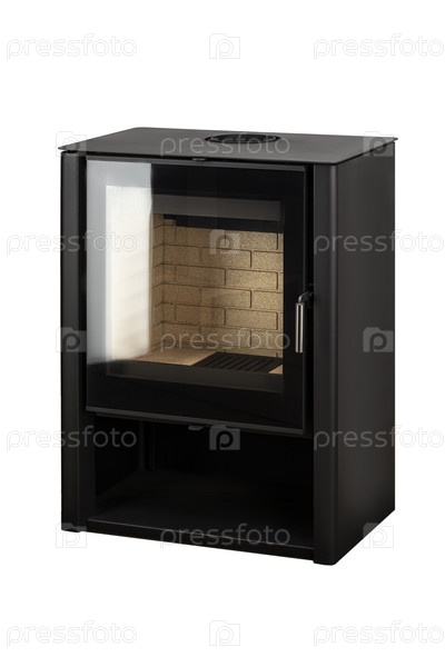 Современные камины для отопления из металла и жаропрочного стекла. Котел на твердом топливе изолирован на белом фоне