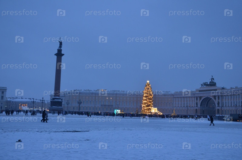 Новогодняя ель на заснеженной Дворцовой площади в Санкт-Петербурге: Александровская колонна (Александрийский столп) и здание Главного штаба