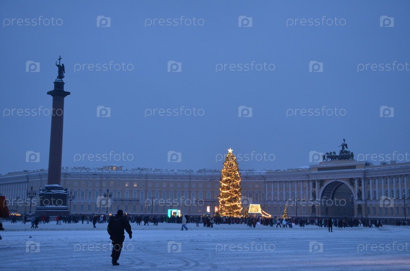 Новогодняя ель на заснеженной Дворцовой площади в Санкт-Петербурге: Александровская колонна (Александрийский столп) и здание Главного штаба