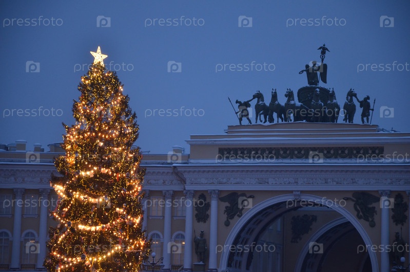 Вид на арку Главного штаба Эрмитажа на фоне новогодней ели и праздничных декораций на Дворцовой площади в Санкт-Петербурге