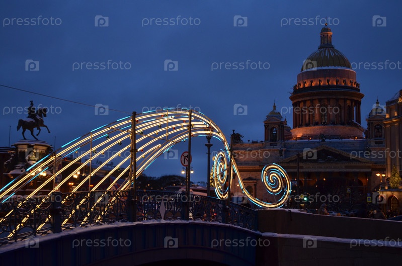 Вид на Исаакиевский собор и памятник царю Николаю I на фоне новогодних украшений Синий мост через реку Мойка в Санкт-Петербурге