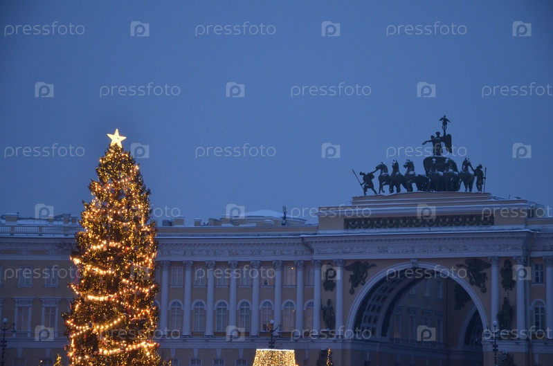 Вид на арку Главного штаба Эрмитажа на фоне новогодней ели и праздничных декораций на Дворцовой площади в Санкт-Петербурге