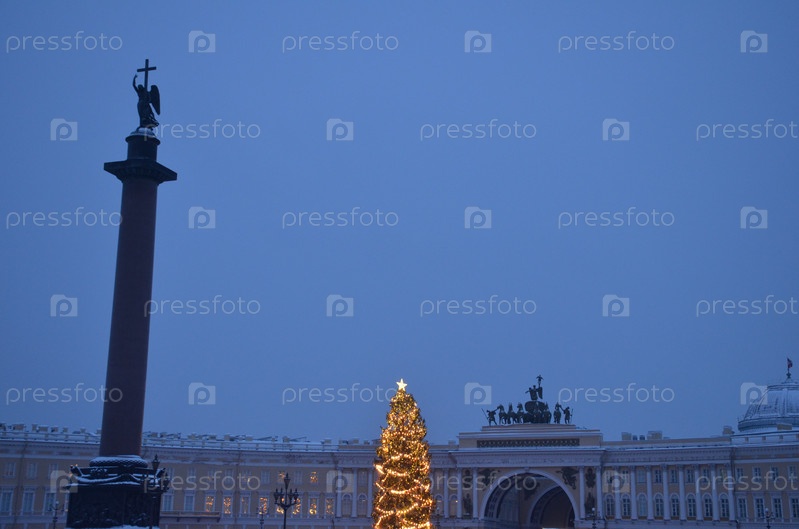 Новогодняя ель на заснеженной Дворцовой площади в Санкт-Петербурге: Александровская колонна (Александрийский столп) и здание Главного штаба