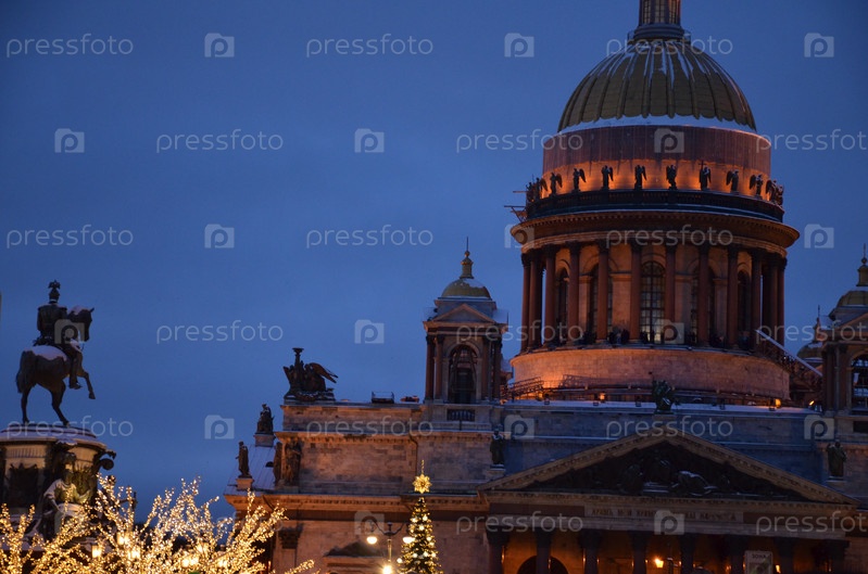 Вид на Исаакиевский собор на фоне новогодних украшений зимнего сада на Синем мосту через реку Мойка в Санкт-Петербурге