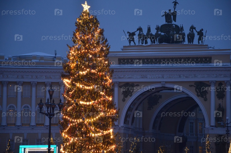 Вид на арку Главного штаба Эрмитажа на фоне новогодней ели и праздничных декораций на Дворцовой площади в Санкт-Петербурге