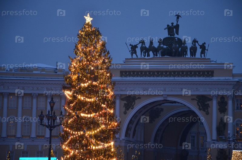 Вид на арку Главного штаба Эрмитажа на фоне новогодней ели и праздничных декораций на Дворцовой площади в Санкт-Петербурге